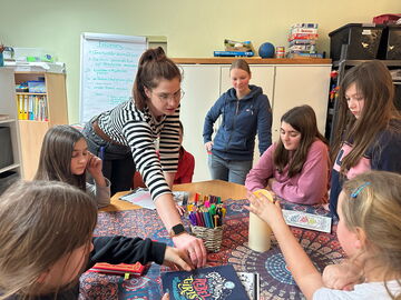 Die Mädchen erzählen mir, dass sie es genießen, einfach mal unter sich sein zu können – „ohne Jungs, die sagen, das ist langweilig, was ihr da macht“. „Hier kann man sich auch einfach mal unterhalten, basteln, malen, Plätzchen backen“.  Von Fußballspielen über Schleim herstellen bis zu Mangas zeichnen – die Ideen sind vielfältig und finden ihren Platz am Nachmittag. Die Themen für die Nachmittage entstehen gemeinsam mit den Mädchen. „Zu Schuljahresbeginn haben wir uns erst einmal zu zweit Zeit genommen und Ideen für die Angebote im neuen Schuljahr gesammelt. Im ersten Treffen des Schuljahres haben wir dann mit den Mädchen gebrainstormt und ihre Ideen aufgenommen. Wir schauen regelmäßig im Jahr auf unser gemeinsames Brainstorming-Poster, was wir noch umsetzen könnten“, erklärt Lilian Scherbarth.
